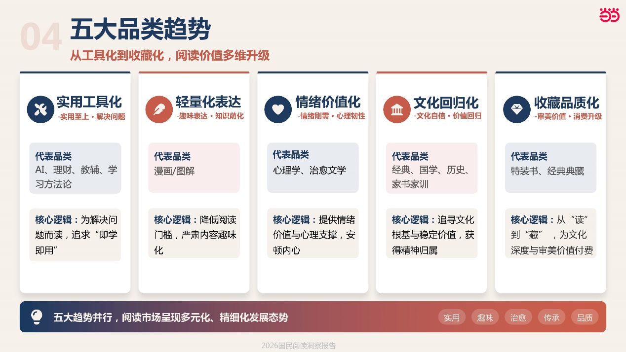 从过去一年图书品类销售数据来看,国民购书需求呈现五大鲜明趋势,彰显“实用、趣味、治愈、传承、品质”的特征: