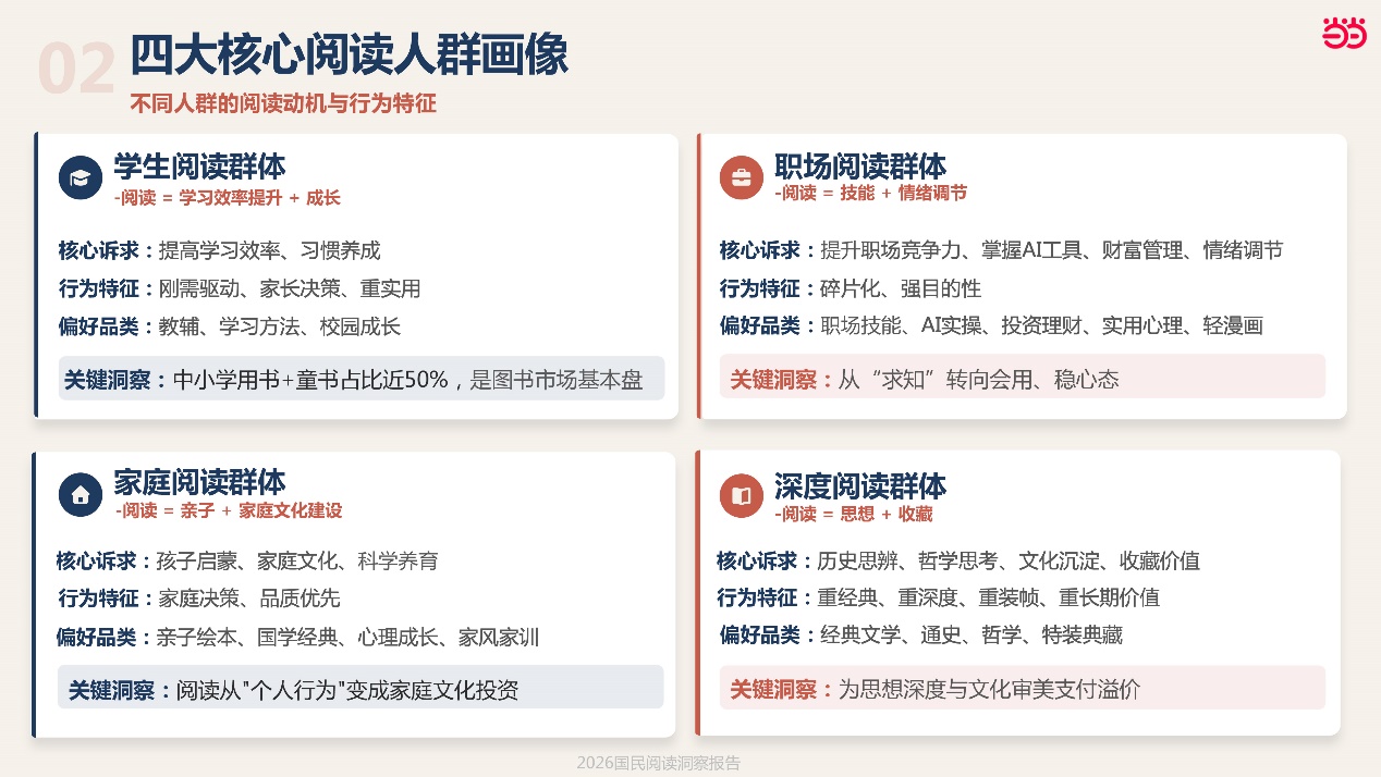 报告通过大数据分析,明确四大阅读核心人群,各人群需求呈现鲜明差异化特征: