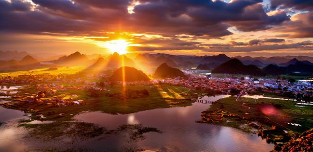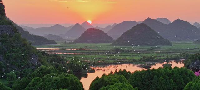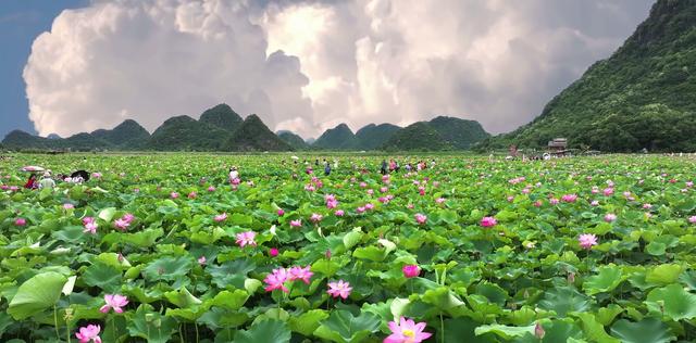 层叠苍翠的峰林拔地而起,碧玉澄澈的湖泊舒展如镜,嫣红灼灼的万亩荷塘绽露芳华,三者相融相契,织就一幅流淌着生机的山水长卷。